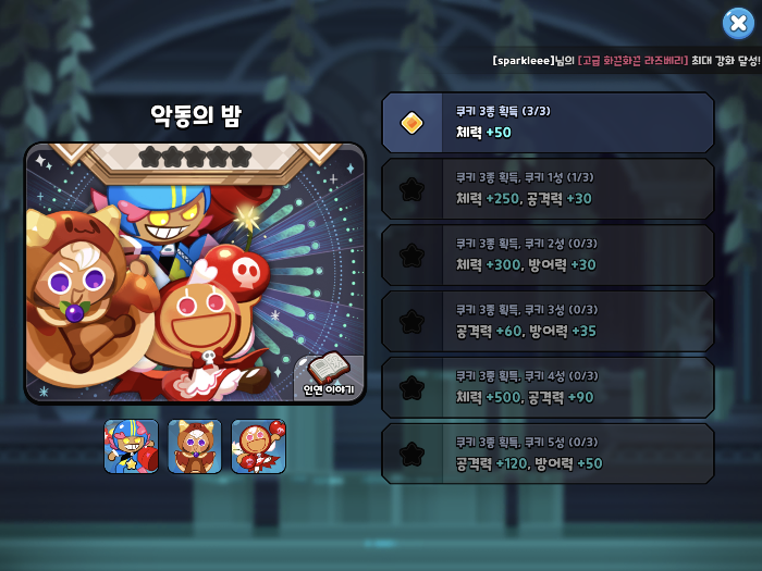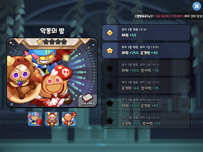 2번째 탭이 활성화가 되었습니다 쿠키 1성(3/3) 3종류 모두 달성 했기 때문이죠