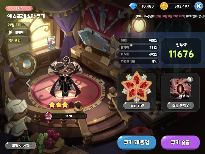 근데 하단을 보면 쿠키 1성 2성 3성 이런식으로 쿠키가 승급되면 다른 버프가 활성화가 됩니다.