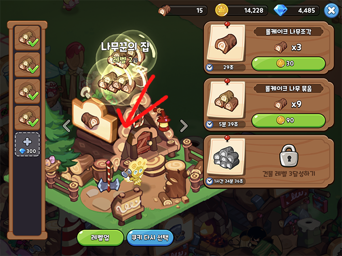 보통 전체 맵에서 작은 집들을 눌러서 완성된 재료를 수거 한 다음 하나씩 누르고