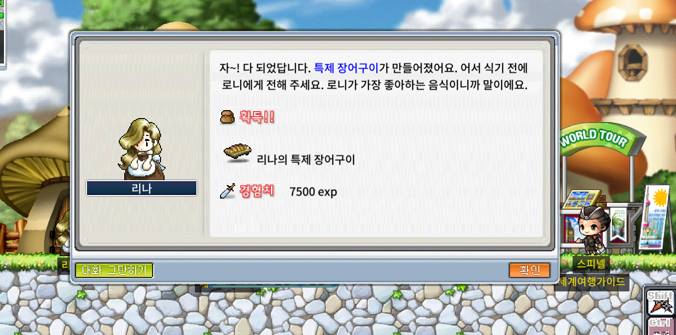 재료를 모아가면 리나가 특제 장어구이랑 달달한 7500 경험치를 줍니다.
