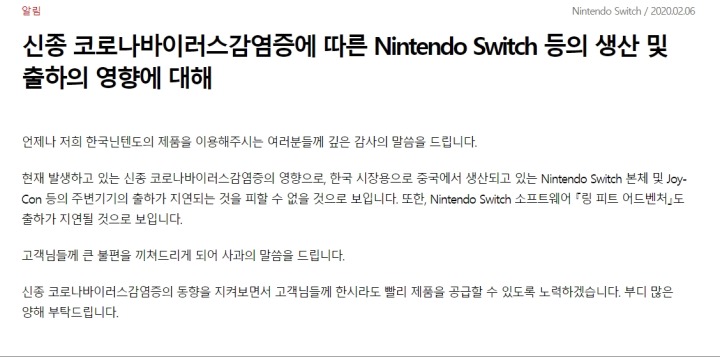 본체, 조이콘 등 중국에서 공급받는 닌텐도 스위치 관련 물품 전반에 영향을 미치고 있고