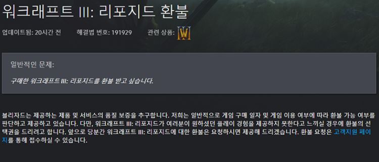 다만 1월 29일 출시된 ‘워크래프트 3: 리포지드’에 한하여 아무런 조건 없이 환불을 신청할 수 있다.